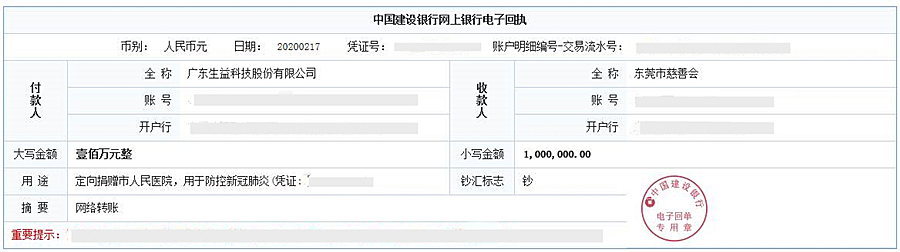 2020年2月16日,生益电子有限公司向东莞市慈善会捐款100万元人民币,款项分别定向捐赠80万元给东莞市第九人民医院和定向捐赠20万元给东莞市东城医院。在此之前,生益电子还向东莞市东城防疫指挥部捐赠3500个专业口罩,解一线防疫人员燃眉之急。