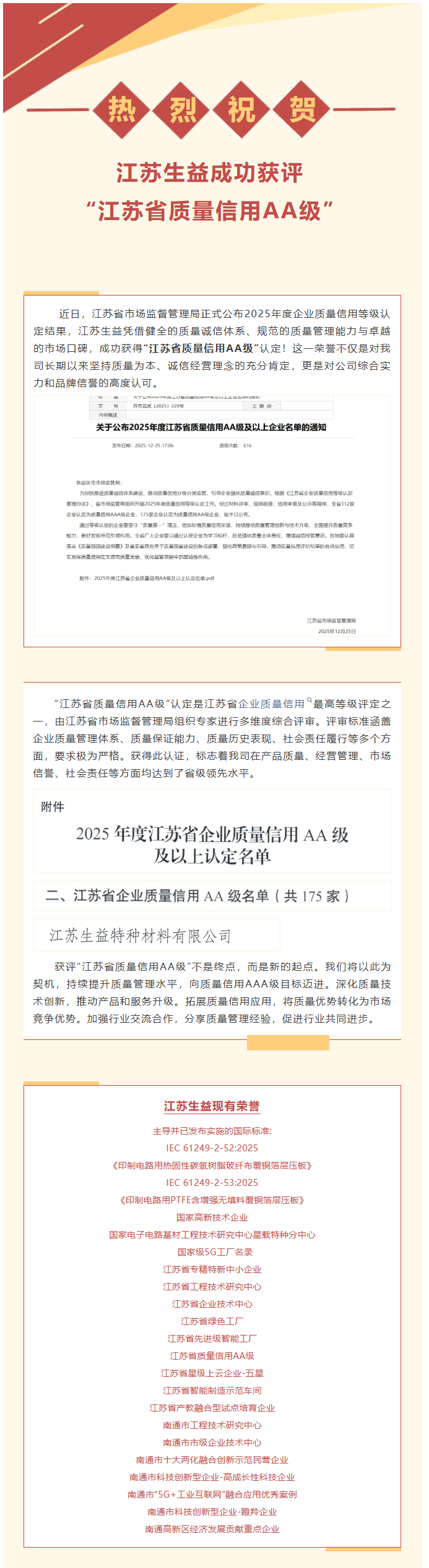以诚信铸品质,以信用赢未来——祝贺江苏生益荣膺“江苏省质量信用AA级”认定