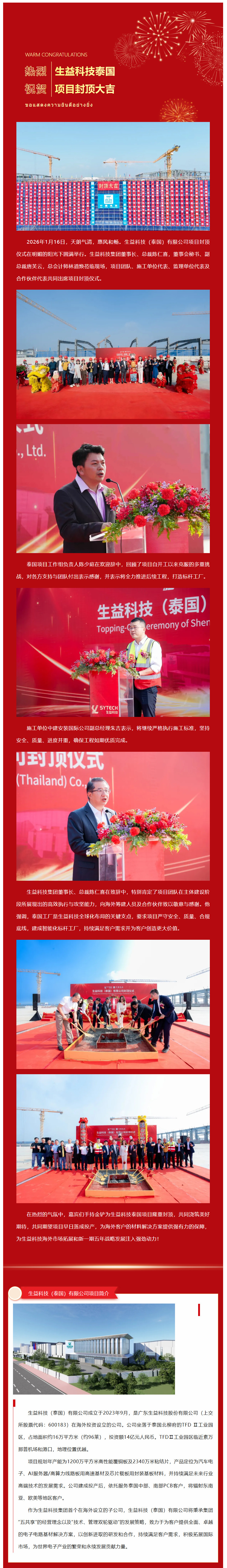 热烈祝贺生益科技泰国项目封顶大吉