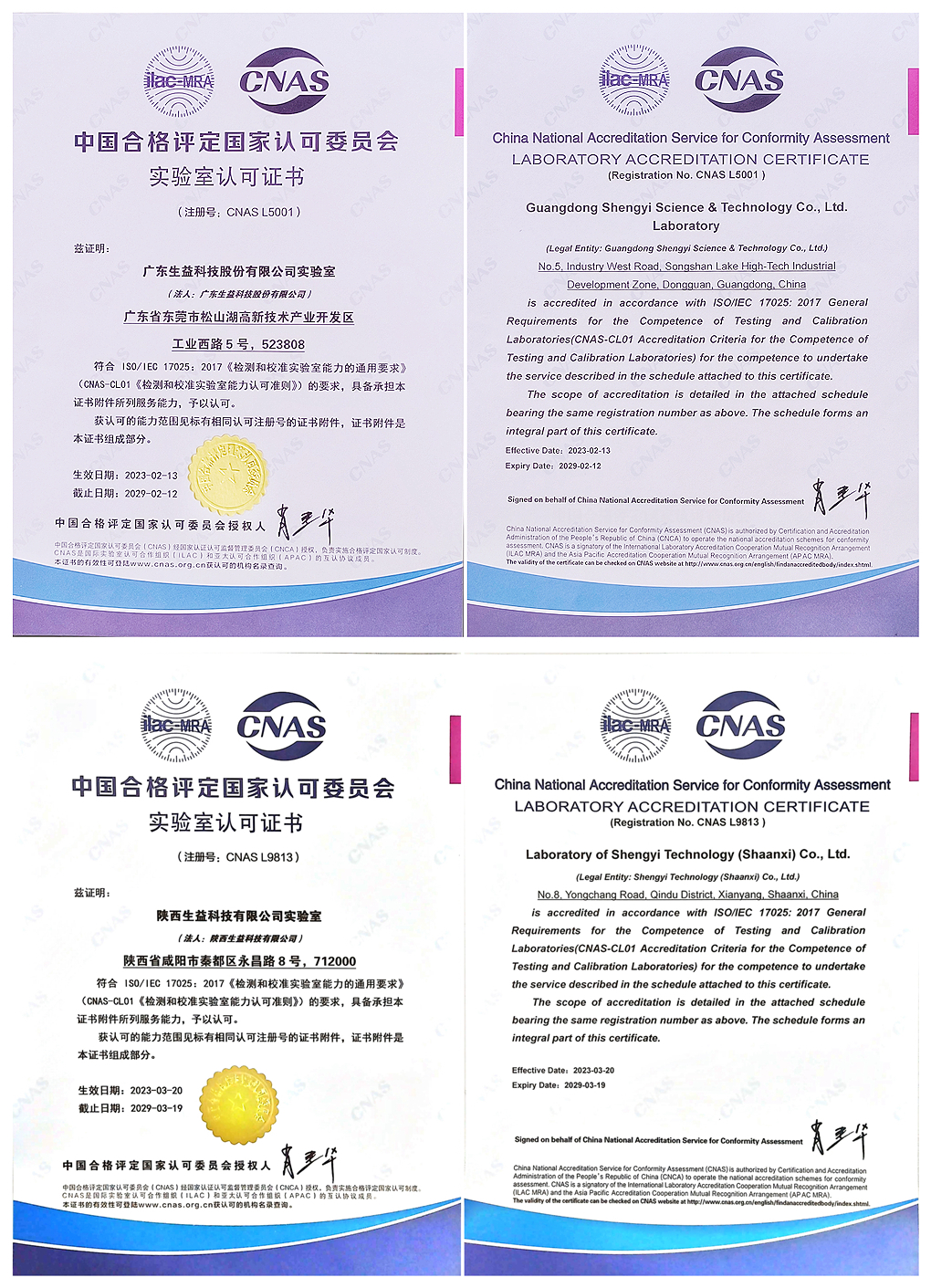 广东生益实验室于2011年3月取得CNAS实验室资格;2012年5月取得CQC(China Quality Certification Centre)现场认可实验室。(右图为CNAS2023年3月-2029年3月实验室认可证书)