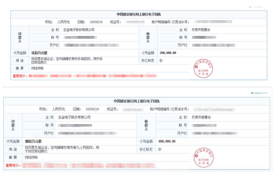 2020年2月16日,生益电子有限公司向东莞市慈善会捐款100万元人民币,款项分别定向捐赠80万元给东莞市第九人民医院和定向捐赠20万元给东莞市东城医院。在此之前,生益电子还向东莞市东城防疫指挥部捐赠3500个专业口罩,解一线防疫人员燃眉之急。